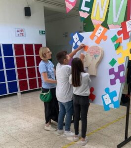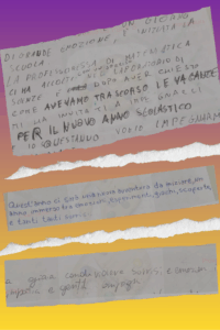 Gli alunni delle prime classi della scuola secondaria di primo grado hanno dato voce alle proprie emozioni attraverso la scrittura: dopo averle annotate su dei bigliettini, hanno composto un mosaico collettivo, simbolo della ricchezza e della varietà dei sentimenti di ciascuno.