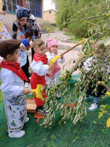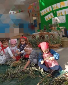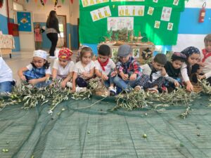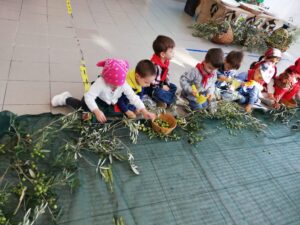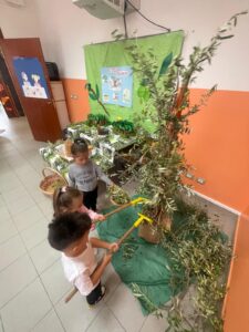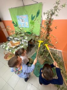 Prima della raccolta, i bambini hanno scoperto l’ulivo attraverso video, storie e attività creative, per poi osservare da vicino una vera pianta nel cortile, riconoscendone le parti e comprendendo l’importanza di questo albero nella nostra tradizione.